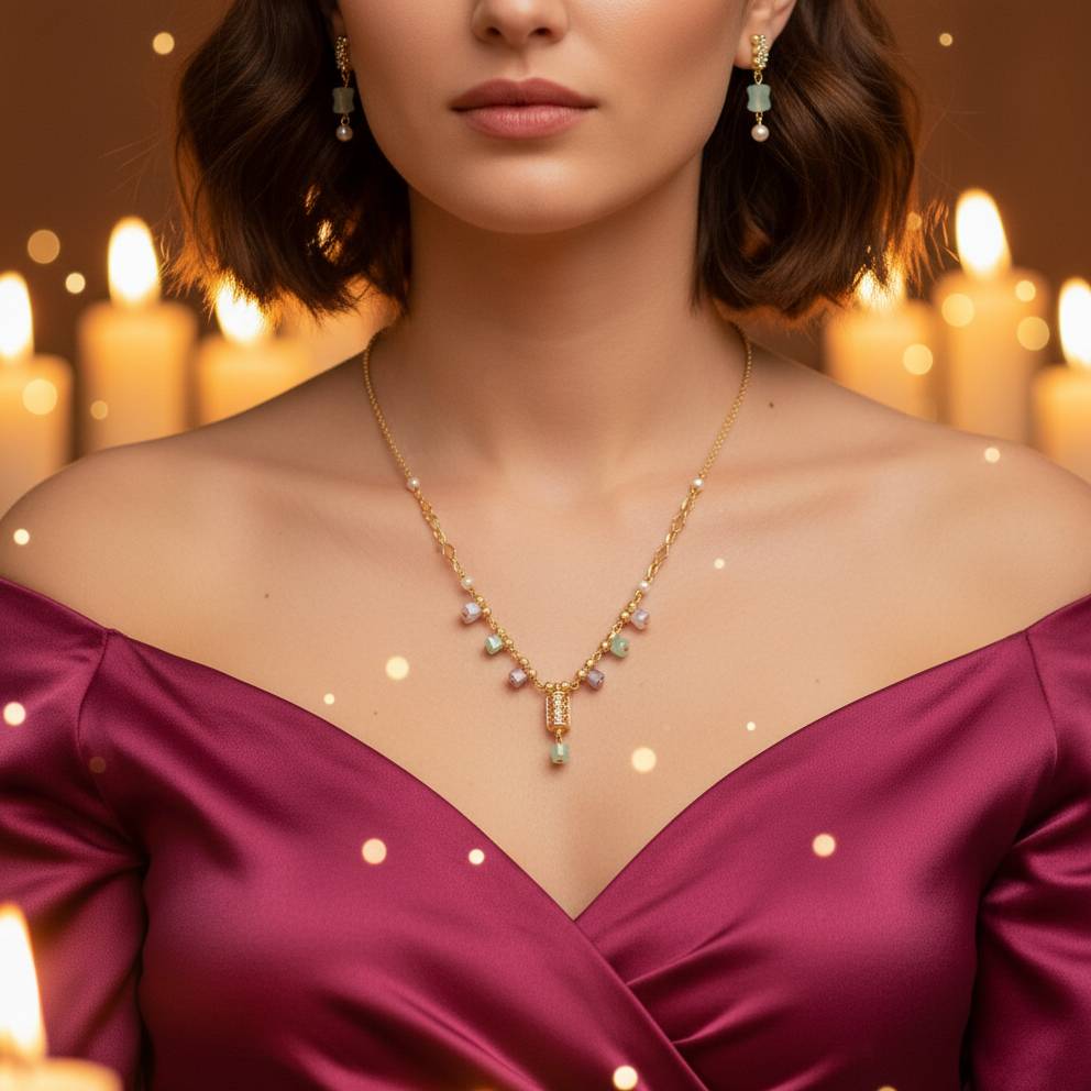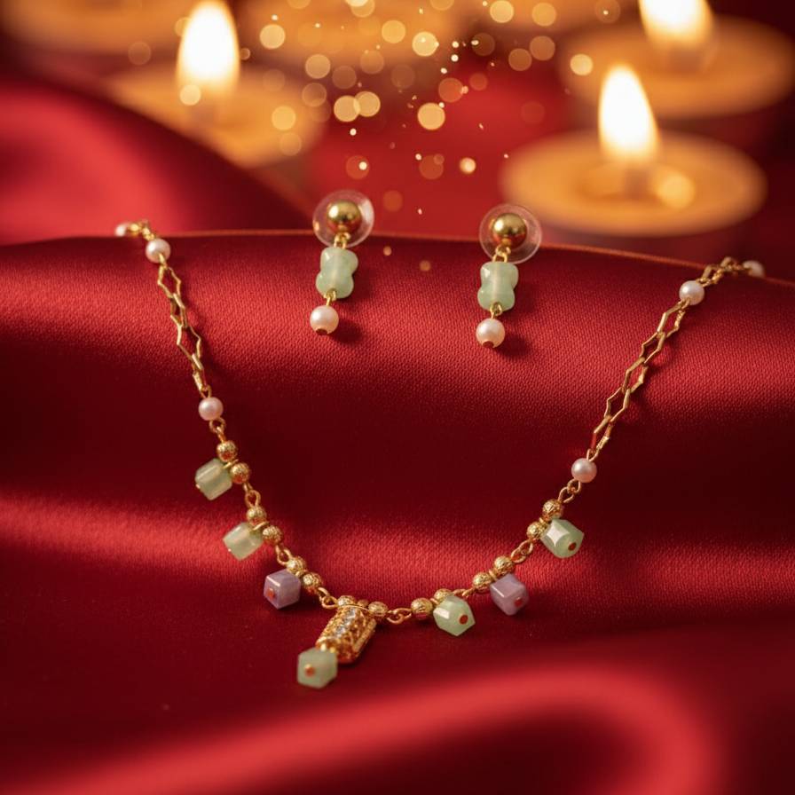 A gold plated necklace set with pastel stones, pearls, and matching earrings – perfect for festive and traditional occasions.