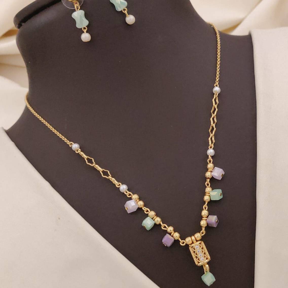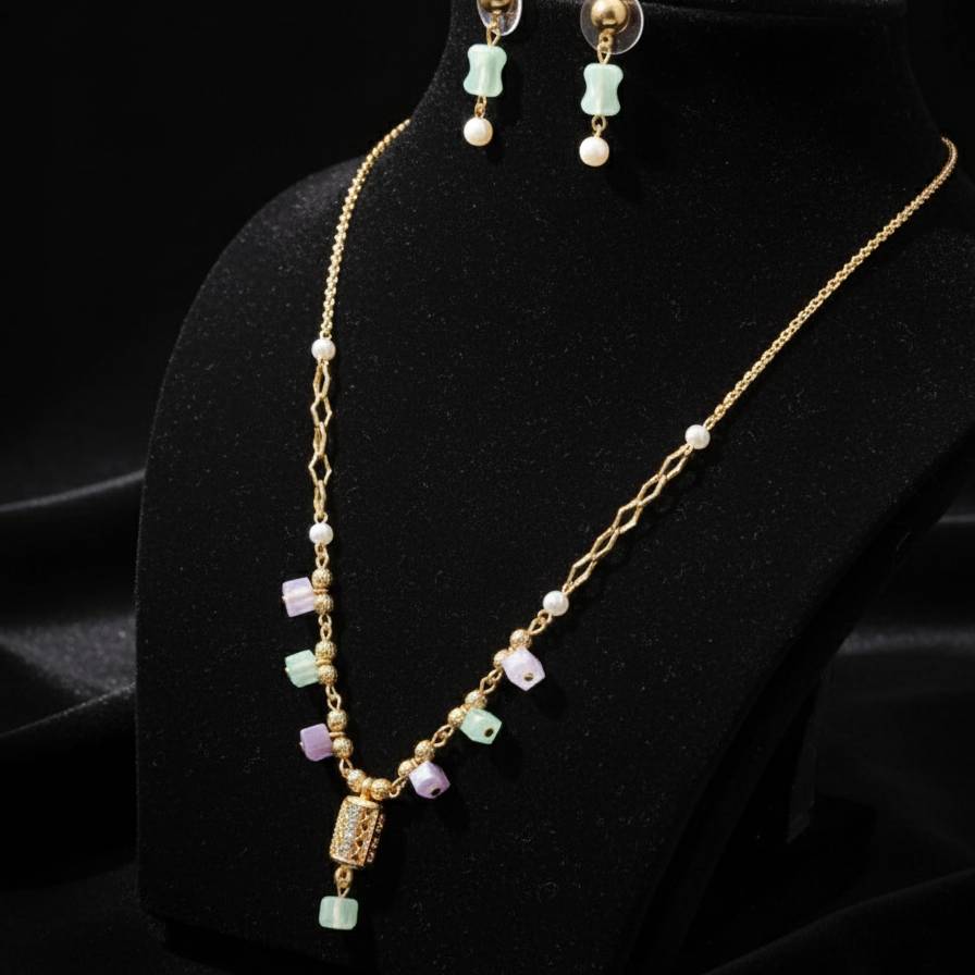 Bring a pop of color and elegance to your jewelry collection with this stunning gold plated necklace set from Monixa Jewels. Designed with intricate golden beads, pearl accents, and pastel-hued stones, this piece is a perfect blend of traditional charm and modern sophistication. The matching earrings complete the look, making it an ideal set for women who love subtle yet striking jewelry.