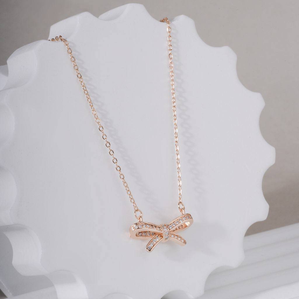 A chic rose gold plated bow pendant necklace with sparkling AD stones, perfect for daily wear and special occasions.