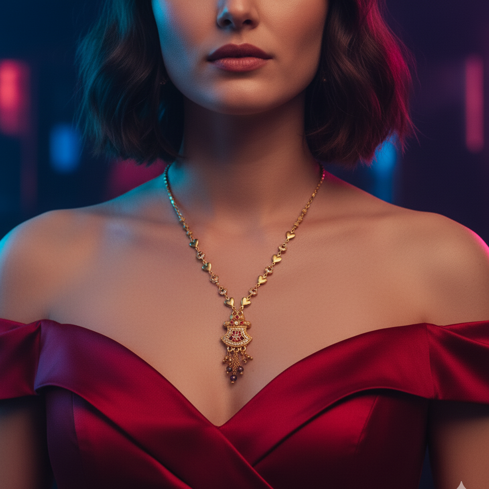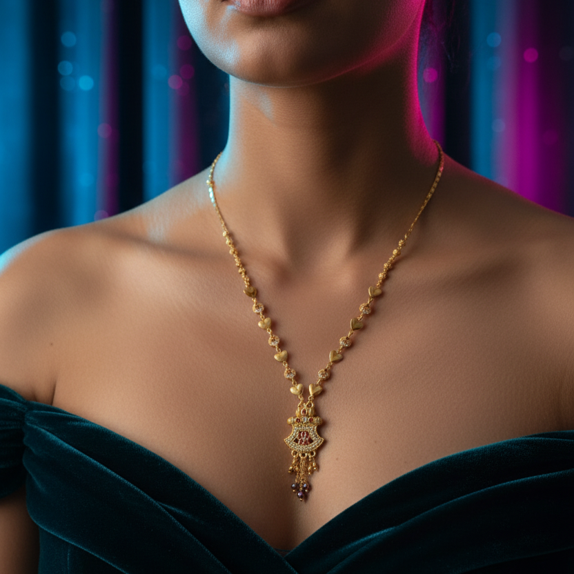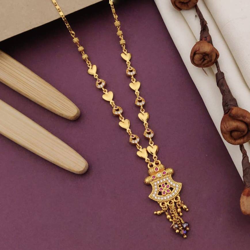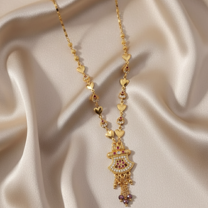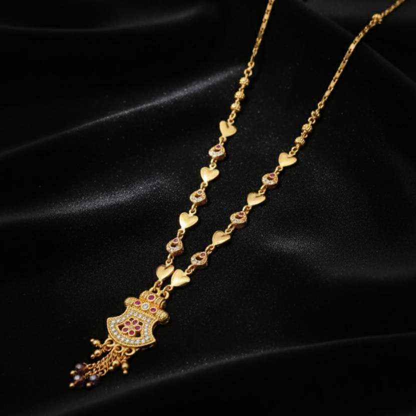 Celebrate the essence of tradition with this beautifully crafted gold plated mangalsutra from Monixa Jewels. Designed with a unique pendant featuring ruby red stones and sparkling AD embellishments, this piece radiates grace and cultural charm. The chain is intricately detailed with delicate heart motifs and beaded accents, adding a touch of elegance and meaning to the design.